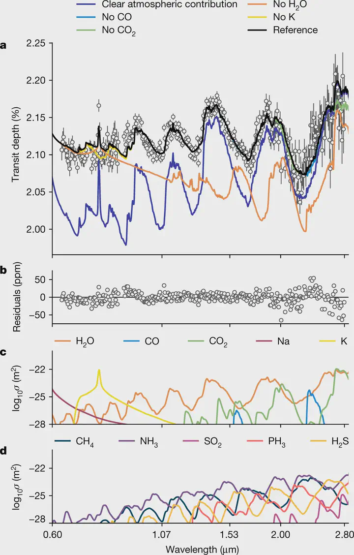 Fig. 3: Interpretation of the constituents of the NIRISS WASP-39b transmission spectrum.The Saturn-mass exoplanet WASP-39b has been the subject of extensive efforts to determine its atmospheric properties using transmission spectroscopy$^1-4$. However, these efforts have been hampered by modelling degeneracies between composition and cloud properties that are caused by limited data quality$^5-9$. Here we present the transmission spectrum of WASP-39b obtained using the Single-Object Slitless Spectroscopy (SOSS) mode of the Near Infrared Imager and Slitless Spectrograph (NIRISS) instrument on the JWST. This spectrum spans 0.6-2.8 ensuremathμm in wavelength and shows several water-absorption bands, the potassium resonance doublet and signatures of clouds. The precision and broad wavelength coverage of NIRISS/SOSS allows us to break model degeneracies between cloud properties and the atmospheric composition of WASP-39b, favouring a heavy-element enhancement (`metallicity’) of about 10-30 times the solar value, a sub-solar carbon-to- oxygen (C/O) ratio and a solar-to-super-solar potassium-to- oxygen (K/O) ratio. The observations are also best explained by wavelength-dependent, non-grey clouds with inhomogeneous coverageof the planet’s terminator.