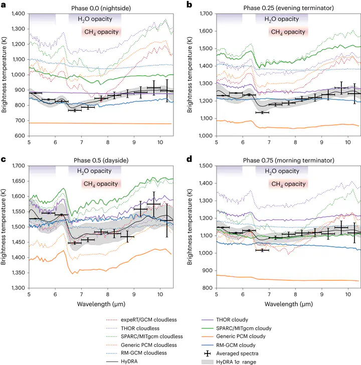 Fig. 3: A comparison of the observed and modelled spectra at different phases.Hot Jupiters are among the best-studied exoplanets, but it is still poorly understood how their chemical composition and cloud properties vary with longitude. Theoretical models predict that clouds may condense on the nightside and that molecular abundances can be driven out of equilibrium by zonal winds. Here we report a phase-resolved emission spectrum of the hot Jupiter WASP-43b measured from 5 ensuremathμm to 12 ensuremathμm with the JWST’s Mid-Infrared Instrument. The spectra reveal a large day-night temperature contrast (with average brightness temperatures of 1,524 ensuremath± 35 K and 863 ensuremath± 23 K, respectively) and evidence for water absorption at all orbital phases. Comparisons with three- dimensional atmospheric models show that both the phase-curve shape and emission spectra strongly suggest the presence of nightside clouds that become optically thick to thermal emission at pressures greater than åisebox-0.5ex~100 mbar. The dayside is consistent with a cloudless atmosphere above the mid-infrared photosphere. Contrary to expectations from equilibrium chemistry but consistent with disequilibrium kinetics models, methane is not detected on the nightside (2ensuremathσ upper limit of 1-6 ppm, depending on model assumptions). Our results provide strong evidence that the atmosphere of WASP-43b is shaped by disequilibrium processes and provide new insights into the properties of the planet’s nightside clouds. However, the remaining discrepancies between our observations and our predictive atmospheric models emphasize the importance of further exploring the effects of clouds and disequilibrium chemistry in numerical models.