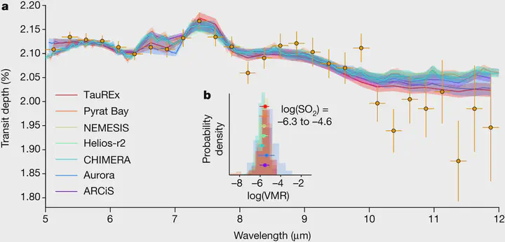 The recent inference of sulfur dioxide (SO$_2$) in the atmosphere of the hot (approximately 1,100 K), Saturn-mass exoplanet WASP-39b from near-infrared JWST observations$^1-3$ suggests that photochemistry is a key process in high-temperature exoplanet atmospheres$^4$. This is because of the low (<1 ppb) abundance of SO$_2$ under thermochemical equilibrium compared with that produced from the photochemistry of H$_2$O and H$_2$S (1-10 ppm)$^4-9$. However, the SO$_2$ inference was made from a single, small molecular feature in the transmission spectrum of WASP-39b at 4.05 ensuremathμm and, therefore, the detection of other SO$_2$ absorption bands at different wavelengths is needed to better constrain the SO$_2$ abundance. Here we report the detection of SO$_2$ spectral features at 7.7 and 8.5 ensuremathμm in the 5-12-ensuremathμm transmission spectrum of WASP-39b measured by the JWST Mid-Infrared Instrument (MIRI) Low Resolution Spectrometer (LRS)$^10$. Our observations suggest an abundance of SO$_2$ of 0.5-25 ppm (1ensuremathσ range), consistent with previous findings$^4$. As well as SO$_2$, we find broad water-vapour absorption features, as well as an unexplained decrease in the transit depth at wavelengths longer than 10 ensuremathμm. Fitting the spectrum with a grid of atmospheric forward models, we derive an atmospheric heavy-element content (metallicity) for WASP-39b of approximately 7.1-8.0 times solar and demonstrate that photochemistry shapes the spectra of WASP-39b across a broad wavelength range.