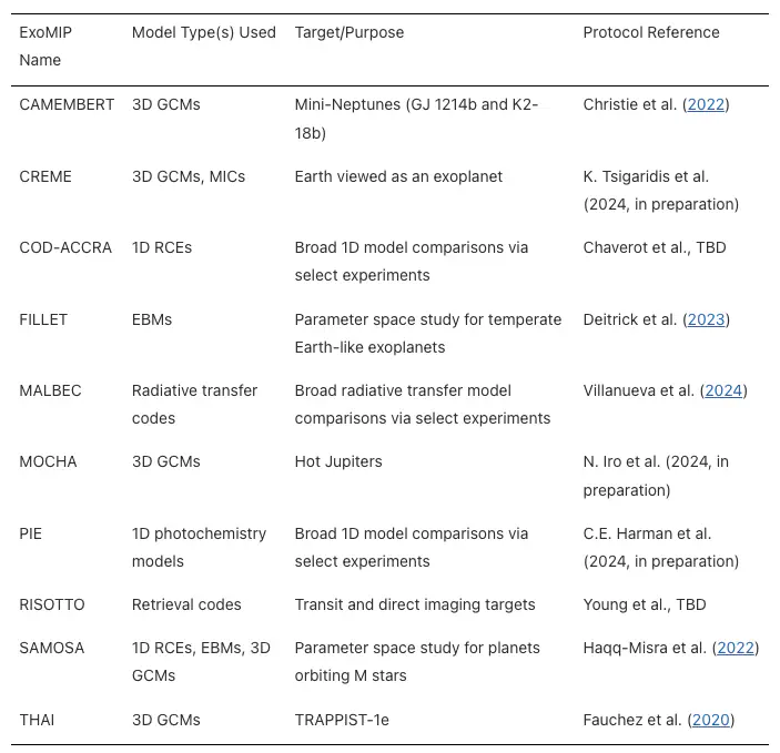 Table 1: The Inaugural Group of CUISINES exoMIPsAs JWST begins to return observations, it is more important than ever that exoplanet climate models can consistently and correctly predict the observability of exoplanets, retrieval of their data, and interpretation of planetary environments from that data. Model intercomparisons play a crucial role in this context, especially now when few data are available to validate model predictions. The CUISINES Working Group of NASA’s Nexus for Exoplanet Systems Science supports a systematic approach to evaluating the performance of exoplanet models and provides here a framework for conducting community-organized exoplanet model intercomparison projects (exoMIPs). The CUISINES framework adapts Earth climate community practices specifically for the needs of the exoplanet researchers, encompassing a range of model types, planetary targets, and parameter space studies. It is intended to help researchers to work collectively, equitably, and openly toward common goals. The CUISINES framework rests on five principles: (1) define in advance what research question(s) the exoMIP is intended to address, (2) create an experimental design that maximizes community participation and advertise it widely, (3) plan a project timeline that allows all exoMIP members to participate fully, (4) generate data products from model output for direct comparison to observations, and (5) create a data management plan that is workable in the present and scalable for the future. Within the first years of its existence, CUISINES is already providing logistical support to 10 exoMIPs and will continue to host annual workshops for further community feedback and presentation of new exoMIP ideas.