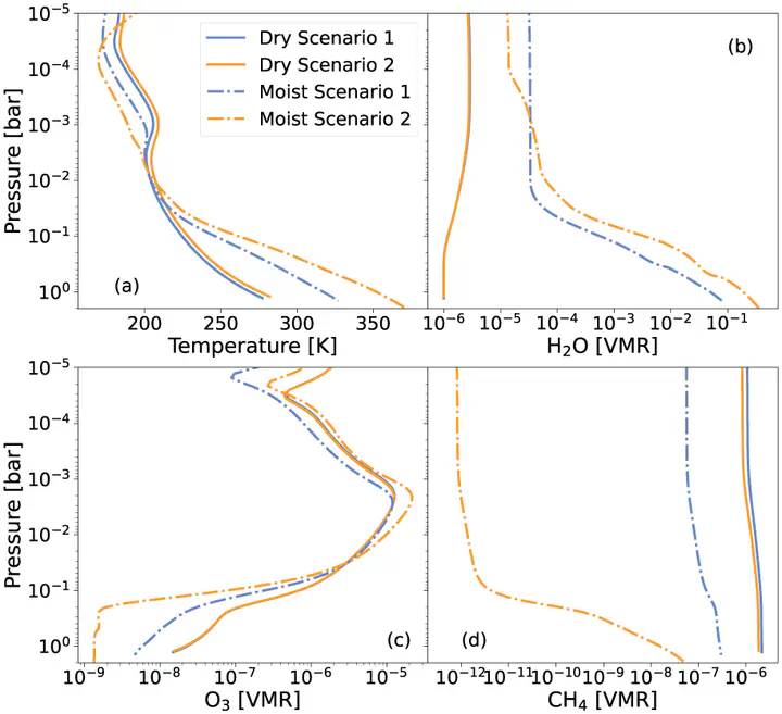 Fig. $: Model results from ID-TERRA.Temperature-dependent biological productivity controls silicate weathering and thereby extends the potential habitable timespan of Earth. Models and theoretical considerations indicate that the runaway greenhouse on Earth-like exoplanets is generally accompanied by a dramatic increase in atmospheric H$_2$O and CO$_2$, which might be observed with the upcoming generation of space telescopes. If an active biosphere extends the habitable timespan of exoplanets similarly to Earth, observing the atmospheric spectra of exoplanets near the inner edge of the habitable zone could then give insights into whether the planet is inhabited. Here, we explore this idea for Earth-like stagnant-lid planets. We find that while for a reduced mantle, a surface biosphere extends the habitable timespan of the planet by about 1 Gyr, for more oxidising conditions, the biologically enhanced rate of weathering becomes increasingly compensated for by an increased supply rate of CO$_2$ to the atmosphere. Observationally, the resulting difference in atmospheric CO$_2$ near the inner edge of the habitable zone is clearly distinguishable between biotic planets with active weathering and abiotic planets that have experienced a runaway greenhouse. For an efficient hydrological cycle, the increased bioproductivity also leads to a CH$_4$ biosignature observable with JWST. As the planet becomes uninhabitable, the H$_2$O infrared absorption bands dominate, but the 4.3-textmum CO$_2$ band remains a clear window into the CO$_2$ abundances. In summary, while the effect of life on the carbonate-silicate cycle leaves a record in the atmospheric spectrum of Earth-like stagnant-lid planets, future work is needed especially to determine the tectonic state and composition of exoplanets and to push forward the development of the next generation of space telescopes.